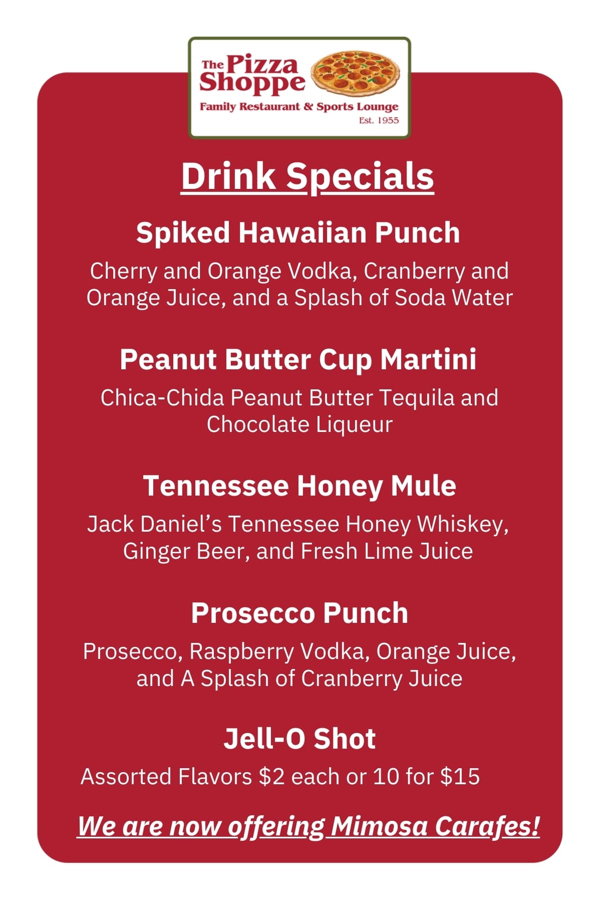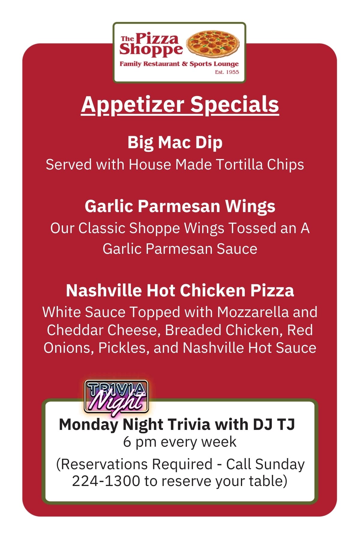 Monthly Specials: $3 Bottles (Bud, Budlight, Miller Lite, Coors Light, Mich Ultra) Draft Special – Budlight Draft 16oz – $4 23oz – $5 Pitchers – $15 All Titos Drinks – $5 Tuesdays: All Large Pizzas – $10 Thursdays: Half off wings (Dine in only) Tuesday Night Pizza Special Large Cheese or Pepperoni Pizza with a pitcher of Bud Light or Golden Road. ONLY $19.55 NO SUBSTITUTIONS DINE IN ONLY Offer good on Tuesdays — Subject to change without notice Subscribe to our email list for a chance to win FREE PIZZA each month! * indicates required Email Address *